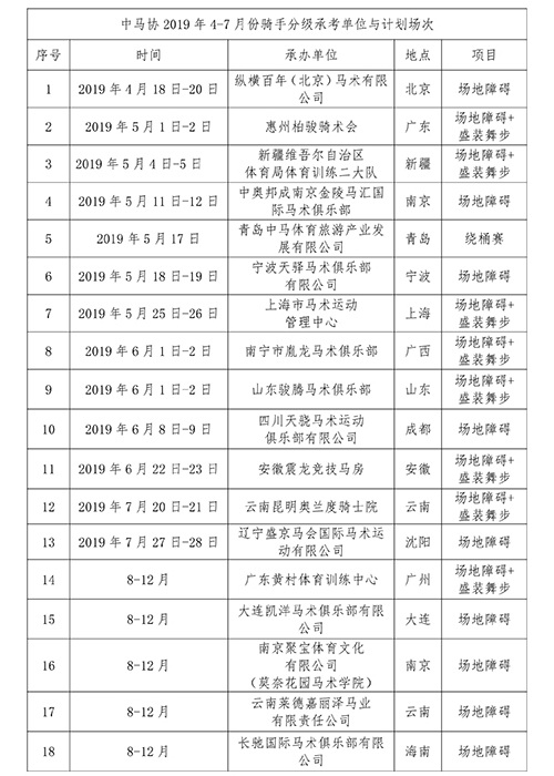 中马协关于公示2019年4-7月份骑手分级考核承考单位与计划场次的通知